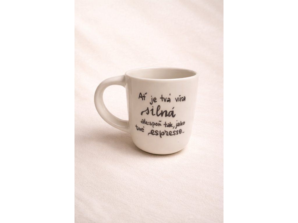 Ručně malovaný hrneček na espresso s autorským nápisem.